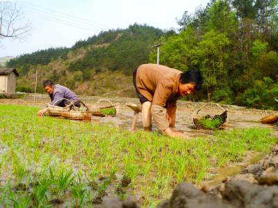 黄田不荒田 4月10日,竹溪县水坪镇黄田湾村党支部书记李善德的残疾哥哥李善文、妻子郭秀芝正在大田里移裁秧苗。该村地处竹溪县北端,与邻县竹山仅一沟之隔,是贫困县里有名的边远贫困村,村里的劳力半数以上外出或搬迁,在国家惠农政策的鼓舞下,留守老人、残疾人和妇女们扛起农业生产的重担,在家安满种足了粮油作物,确保粮食增产、家庭增收。图为农民种植的粮油种作物。(本报视界网 王忠春 摄)