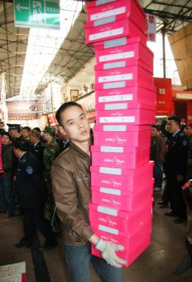 4月13日,江汉区消防、城管等部门联合整治大兴路华森鞋市占道经营,一店主一气抱起13个鞋盒,如杂耍般慌忙将其转移至店中。 易边 摄 江汉区园林局 张垠 430022