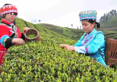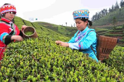 4月11日,湖北省宣恩县马鞍山村的土家姑娘汤红和汤华正在采摘茶叶鲜叶。姐妹俩采摘的鲜叶由茶叶专业合作社收购、制成有机茶销往欧美、韩国、日本等地。