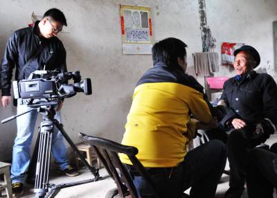 图0580号为央视记者采访安阳镇余咀村外迁移民书记赵久福84岁的老父亲赵守全时的情景。