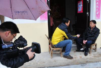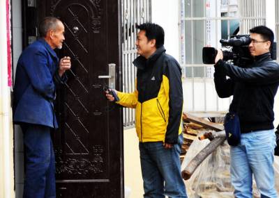 图0520号为央视记者吴闯(中)采访安阳镇余咀村82岁的内安移民张国夲时的情景。