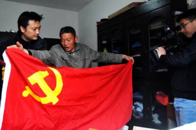 图0556号为央视记者采访安阳镇余咀村内安移民村主任赵吉国接过外迁移民书记赵久福手中党旗时的情景。