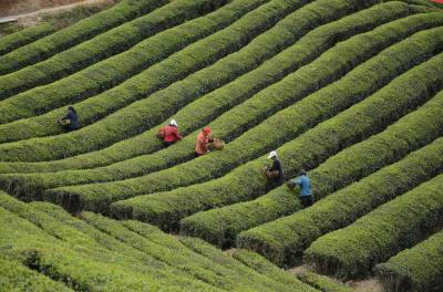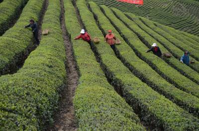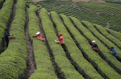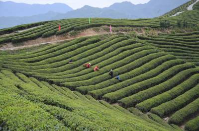 4月14日,几位留守妇女在保康县城关镇螺丝沟茶场采摘春茶。 近年来,保康县把茶叶产业作为农民增收致富的主导产业来抓,在新品种和新技术推广上下功夫,全力打造“保康”品牌茶叶,茶叶面积已达12万亩。今年春茶开采以来,该县约有70%的农户需要雇人帮助采茶。由于大量劳力外出务工,农村留守妇女便成了成了采茶的主力军,特别抢手。 据了解,采茶的工价是每公斤30元,每人一天能挣100元左右。(本报视界网 陈泉霖 摄)