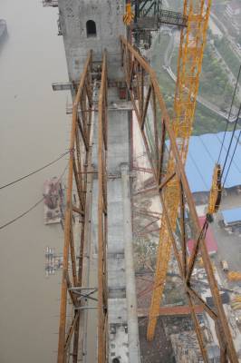 图为:鹦鹉洲长江大桥1号墩上横梁第三片桁架塔设施工现场