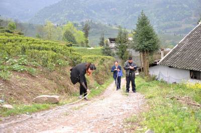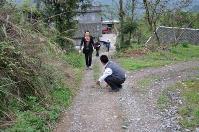 4月16日,宣恩县万寨乡特色民居建设专班人员在伍家台村丈量概算特色民居建设附属工程---连户路铺设油路里程。