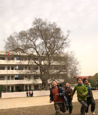 小学校,国旗,古树,一群活泼的农村孩子。就象这棵古树旺盛的生命力又绽放出新芽。 张文胜 摄
