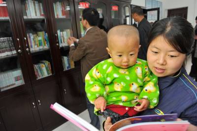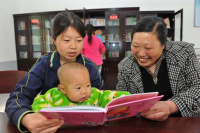 4月21日,保康县城关镇金盘洞村村民带着小孩在农家书屋里看书。