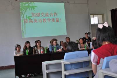 20日下午,湖北省职院六名外教来到汉川市庙头中学,开展以“英语口语交际与技巧”为主题的互动教研活动。整个英语口语互动分为三个阶段,他们把七、八、九年级各分为一组,每组开展一个小时的互动交流,该校全体英语教师参与了交流活动。