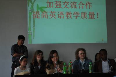 “How are you?”“ Pretty good,thank you.”在汉川市庙头中学阶梯教室内,几名外教与学生正在开展充满激情的互动。台上台下的师生从学习、生活、环保、国际事件等多方面进行交流。当有学生对外教老师所说的意思表示不太清楚时,一名满头银发的外国老太太像复读机一样再次用英语慢慢复述,并用比较流利的普通话进行了翻译,直到学生露出恍然大悟的模样,能用英语简单回答才露出满意的笑容。