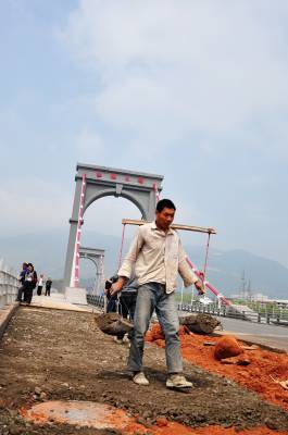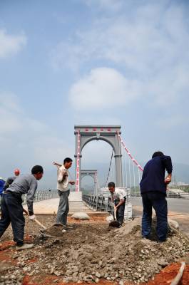 4月22日,工人正在恩施红旗大桥人行道路面进行统一铺装。目前,由中铁大桥局七公司施工的恩施红旗大桥大桥主体结构工程和路面铺设工作已经竣工,桥梁已具备通车条件。根据恩施市规划,红旗大桥主桥结构体系为双索面自锚式混凝土悬索桥,总投资8000多万元,全长340.6米,是连接恩施城北新区与老城区的主要通道,大桥将于“五一”前通车。