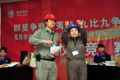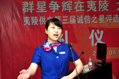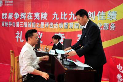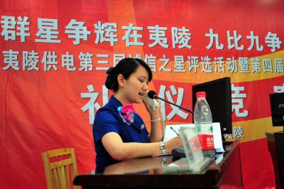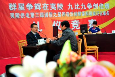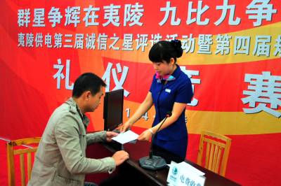 2011年4月23日,湖北省宜昌市夷陵区供电系统举办以“群星争辉在夷陵、九比九争创佳绩”为主题的规范化服务礼仪竞赛活动,通过模拟供电营业厅场景,对服务人员礼仪、业务知识和应变能力进行测试,充分展现出了供电服务人员的优良窗口形象,现场还评选出了夷陵供电系统第三届诚信之星。本报视界网 张国荣 摄