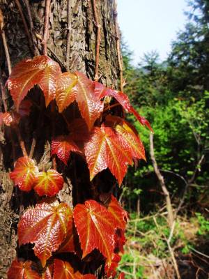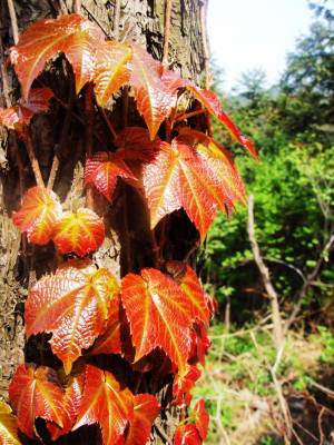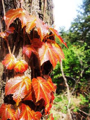 爬山虎的嫩枝沿着松树的老皮向上攀援,显示出一种强大的生命力。杨金华摄