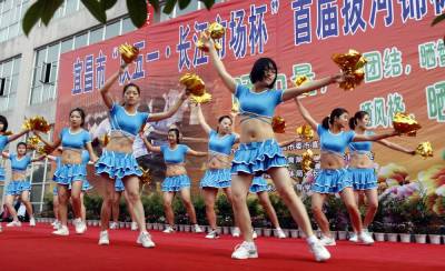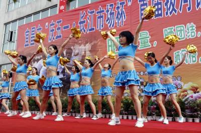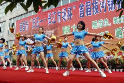 健美操为拔河比赛助兴 2011年4月23日,表演者在表演健美操为拔河比赛助兴。当天,湖北省宜昌市直机关工委、市体育局联合举办的庆“五一长江市场杯”拔河锦标赛,在长江市场开赛,比赛分市直机关和企事业单位、县市区、大专院校3个700公斤级混合组进行,来自县市区、大专院校、市直机关、企事业单位50多支代表队参加比赛。文振效