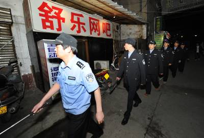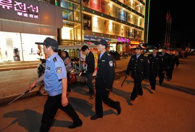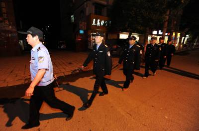 5月23日晚11点,南漳县公安局夜间巡逻队在新时代广场附近巡逻。每晚10点至次日凌晨5点,20余名民警与协警组成的巡逻队都会在宾馆、网吧、车站等人流密集的公共场所巡逻。自2010年南漳县公安局实施“警灯闪烁”工程以来,城区案发率有了明显下降,居民平安感大幅提高。(记者 李溪 本报视界网 晏光辉 摄)