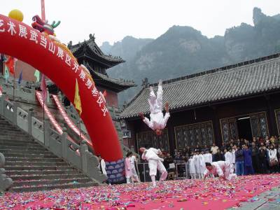 武当山旅游经济特区为弘扬武当武术,组织武当山各武术馆校通过挖整,以师带徒,办武馆、武当功夫养生院、擂台赛等 “以武演道,以道显武”,“ 修性养生,健身长寿”, 使成千上万的国内外弟子学道武当武术,一展武当武功神韵风采,令人叫绝称奇。