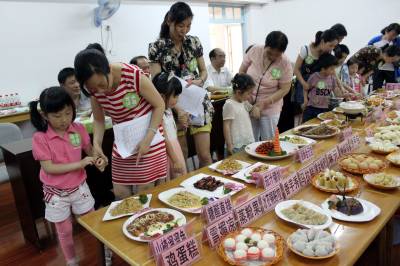 5月20日上午,旨在“让孩子们吃的科学、吃的健康,身体素质得到全面发展”的武汉市市直机关永红幼儿园2012年炊事人员技能比赛的现场,用10张幼儿课桌拼成6平方米的大餐桌,上面分别摆放着24种红、白案菜肴和面点,1500名在园孩子中的12名“孩子评委”与12名“家长评委”一起,绕桌巡视,回到坐位上,听着两位中国烹饪大师、武汉商业服务学院副教授对永红幼儿园15名厨师制作的菜肴和面点逐一介绍,点评其烹饪要领与特点,令平时爱闹的孩子们出奇地安静,个个听得十分认真,不时悄悄地告诉家长,最后由专家家长幼儿代表评出了红案陈国斌、白案王蓉一等奖。这次比赛评比就是孩子们“最好吃”的评价说了算 。
