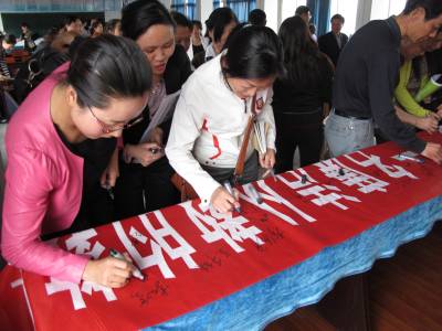 钟祥市莫愁一路小学采取多种形式推进廉政文化进校园活动,倡导教师争做廉洁教师。5月25日下午,该校开展了“廉洁从教”集体签名活动,全校93名教职工在“拒绝有偿家教,拒绝家长请吃请钓,拒绝收受礼品礼金,拒绝乱收费,做一名廉洁从教的教师”横幅上签下自己的名字。 (本报视界网 杨中进 摄)