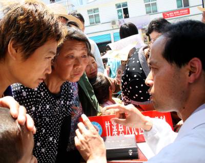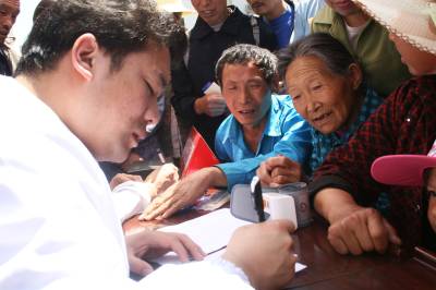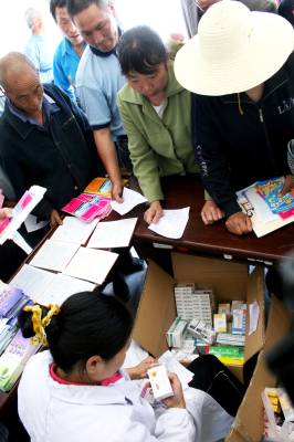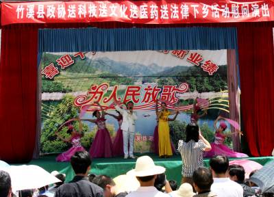 5月26日,竹溪县“四下乡”慰问团医疗队员为移民群众义诊。当日,由湖北省竹溪县政协组织的文化、科技、卫生、法律“四下乡”活动走进潘口电站移民乡——兵营乡的新集镇,为移民群众带来文艺节目、医疗知识、产业发展致富信息、法律法规知识等物资和精神“食粮”。据悉,当日“四下乡”慰问团赠送科技、法律、健康卫生等方面的书籍和宣传资料2000余份,为300余人进行了义诊,发放10000余元免费药品,文艺工作者奉献了一台精彩的文艺节目,让广大移民朋友享受精神文化“大餐”。