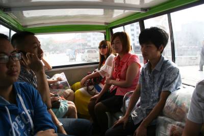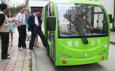 5月27日,市民乘坐绿色电动公交车。竹溪县城关镇居民汪成甲投资购买的首批两台绿色电动公交车试运营已近10天,因其环保及价格便宜深受市民欢迎,汪成甲还订购了10台电动公交车,到位后将投入运营。
