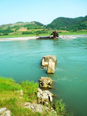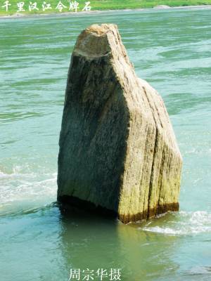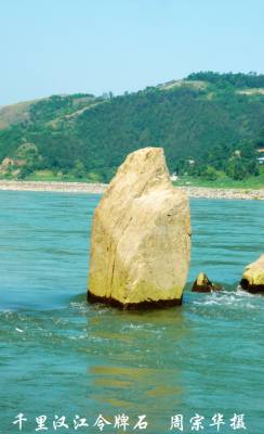 “令牌石”坐落于三千里汉江南岸郧县五峰乡曹家湾村境内。高2.7米,宽1.1米,厚0.7米,是三千里汉江知名景观之一。附近有班船码头和水文站,对面有丰富的河沙资源。2014年,南水北调中线工程丹江口水库蓄水至170米之后,令牌石景点将被永久性淹没而消失。笔者据此特意拍照,为好友们留作永久性共享和纪念。(本报视界网周宗华摄)
