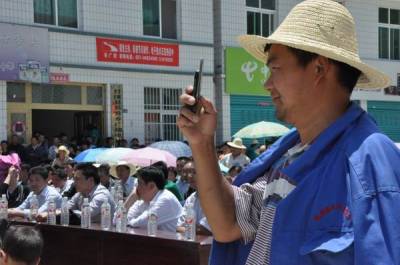 5月26日,由竹溪县委宣传部组织的文化下乡活动在兵营乡举行启动仪式,当地数百群众不顾农忙,前来观看演出,图为一农民边看边用手机拍摄演出活动。(毛光明 摄)