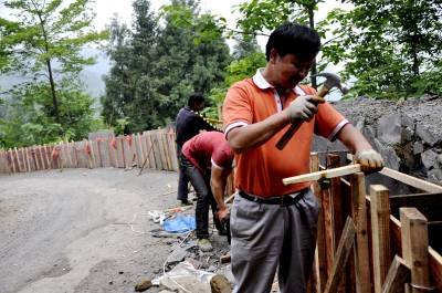 5月28日,几名工人正在恩施市红土乡红土溪村浇筑公路“防护墙”。