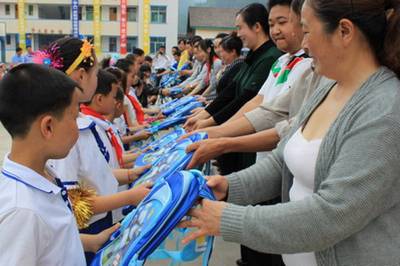 10点,学校全体教师对留守儿童进行结对帮扶,为他们捐赠了新书包。