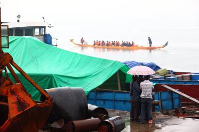 5月29日,大雨,茅坪港湾第一艘训练龙舟下水。