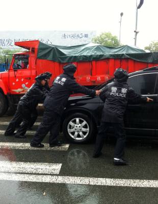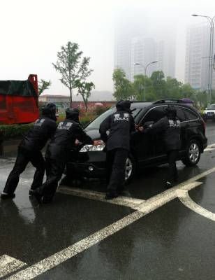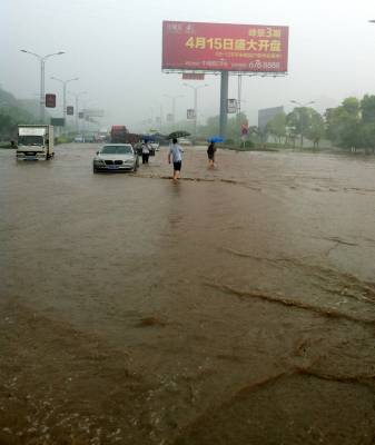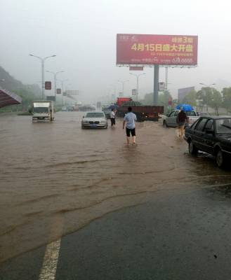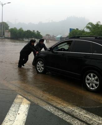 2012年5月29日,持续暴雨致使宜昌市夷陵区发展大道清江润城路段大量路面积水,多辆汽车被困、交通中断,成为一片汪洋“泽国”。 宜昌市夷陵区交警大队小溪塔中队接到报警后,30多名民警火速赶往事发现场,立即会同城建等部门启动《雨、雾、雪天气应急预案》,对堵塞车辆实行分流,将深陷“泽国”的20多台车辆推出“重围”,安排拖车将车辆拖往维修店维修。城建部门迅即调集挖掘机对现场的积水实施挖沟排水。目前,排水清污工作正在紧张有序的进行。 本报视界网 向奥 张国荣 摄