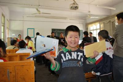 4月24日,28名来自上海、长沙等地的“麦田”志愿者来到竹山县,向该县宝丰、柳林等乡镇的234名资助对象发放了7.39万元资助款,捐赠图书1000多册,回访“麦田图书室”2个。据统计,自“麦田计划”2007年走进竹山以来,共为贫困学生发放助学款近40万元,捐赠图书万余册,建成学校图书室5个。图为荣获“湖北省美德少年”的竹山县宝丰镇黄栗小学三年级学生徐航高兴地领取“麦田计划”志愿者发放的助学款和学习用品。