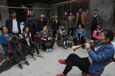 5月28日,记者来到建始县红岩寺镇里三坦村4组女子“锣鼓队”在农家小院,给村民演出。
