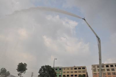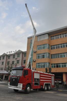 该举高喷射消防车可载水10吨、泡沫2吨,曲臂最高可达16米,车载水炮既可喷射水,又可喷射泡沫,射程达75米。此次购置的举高喷射 消防车,主要用于城镇、工矿企业高层建筑以及石油、化工、油罐、仓库等高大建筑物的火灾扑救。该车采用折叠式臂架,全方位回转,操 作简便灵活,可以在距火源较远的位置独立完成灭火作业。