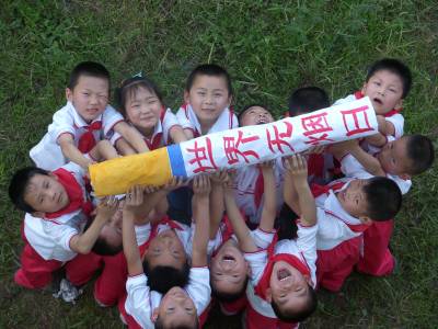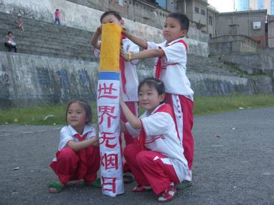 5月30日,湖北省十堰市郧县实验小学学生展示和老师一起制作的巨型“香烟”。当日,湖北省十堰市郧县实验小学开展“拒绝烟草 从小做起”宣传教育活动,迎接5月31日“世界无烟日”的到来。(王瑞平 摄)