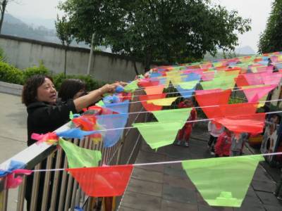 5月30日下午,竹山县潘口乡中心幼儿园教师在该园娱乐场上挂彩旗。临近“六一”,该园教师们积极行动起来,在活动室内悬挂彩色气球、塑料挂花;在走廊的墙壁上张贴幼儿们喜欢的卡通画等;在园内围墙上插彩旗,人行道两旁摆满鲜花。扮靓幼儿园,营造喜庆、祥和的节日气氛,喜迎“六一”儿童节的到来。(视界网 王定生 摄)