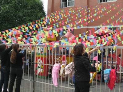 5月30日下午,竹山县潘口乡中心幼儿园教师在该园娱乐场上挂彩旗(如图)。临近“六一”,该园教师们积极行动起来,在活动室内悬挂彩色气球、塑料挂花;在走廊的墙壁上张贴幼儿们喜欢的卡通画等;在园内围墙上插彩旗,人行道两旁摆满鲜花。扮靓幼儿园,营造喜庆、祥和的节日气氛,喜迎“六一”儿童节的到来。(视界网 王定生 摄)