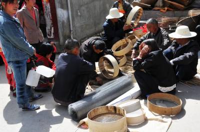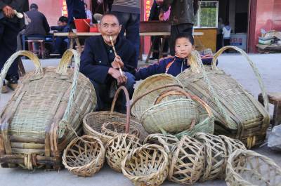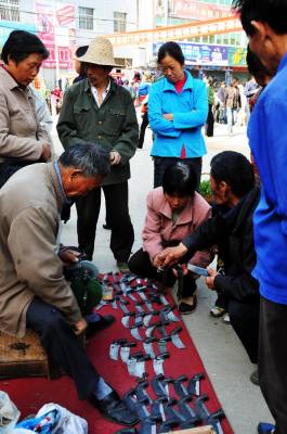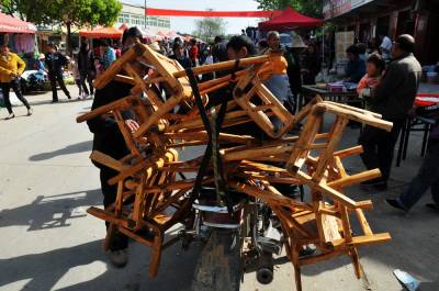 4月24日,湖北省郧县与河南省交界的口子镇梅铺镇庙会已进入第三天,庙会的三天大戏和文体活动与物资交流吸引着两省农民前来观看和采购,最受欢迎的还是手工编织品,镰刀,板凳和椅子。 图为逛庙会的农民正在选购自已的商品时的情景。 周家山摄 郧县城管大队 电话13872840078 邮编442500