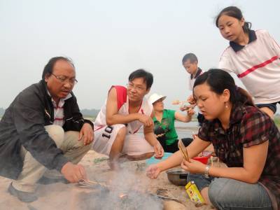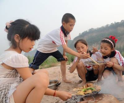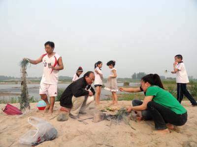 郧县刘洞镇九年一贯制学校倡导教师们每个周末带家人去郊外游玩一次,缓解工作压力,适时放松身心,同时加强家人间的交流,弥补平时因工作繁忙而缺少的亲情。 图为6月1日,该校教师带着孩子们在河畔野炊,陪孩子嬉戏,教孩子烧烤。