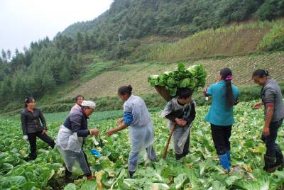 海拔1600米的宣恩县椿木营乡,近几年来,因地制宜大力发展高山特色产业——烟叶、药材、反季节蔬菜各1万亩,人平达到1亩以上,农民增收致富奔小康。图为,该乡挖断山村菜农大白菜丰收的情景。