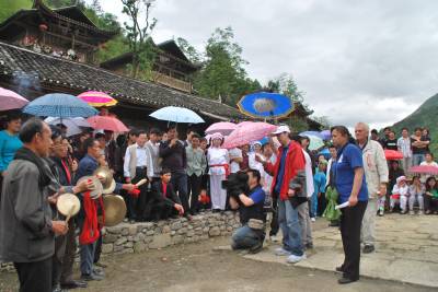 彭家寨位于宣恩县沙道镇两河村,这里青山叠翠、溪水孱孱、风光旖旎,气候宜人,是省级文物保护单位,独特的吊脚楼群吸引客人来此旅游,可以吃农家饭、看摆手舞,尽情享受农家乐。2009年5月12日,彭家寨土家人敲锣打鼓迎接美国好莱坞电影制片总裁来比先生来该寨拍摄《传奇之地》电视片。图为:央视记者在彭家寨拍摄电视片《传奇之地》