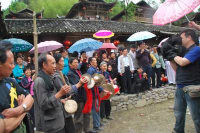 彭家寨位于宣恩县沙道镇两河村,这里青山叠翠、溪水孱孱、风光旖旎,气候宜人,是省级文物保护单位,独特的吊脚楼群吸引客人来此旅游,可以吃农家饭、看摆手舞,尽情享受农家乐。2009年5月12日,彭家寨土家人敲锣打鼓迎接美国好莱坞电影制片总裁来比先生来该寨拍摄《传奇之地》电视片。图为:央视记者在彭家寨拍摄电视片《传奇之地》现场