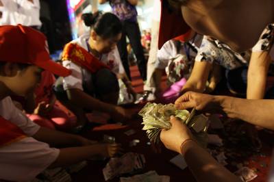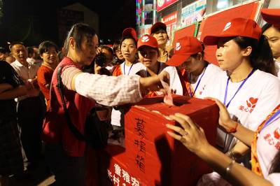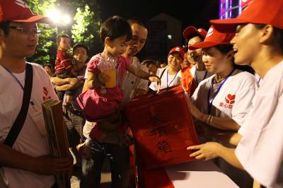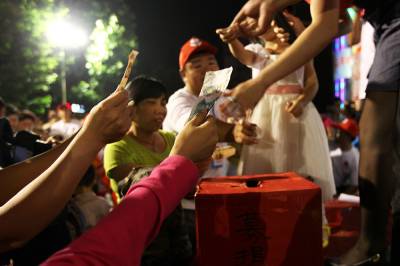 昨晚7点,在武汉市新洲区阳逻街武商量贩大门口,一场为拯救白血病女孩的大型义演义卖晚会正在进行,现场人头攒动气氛热烈,许多市民纷纷掏出钱来排着队捐款。