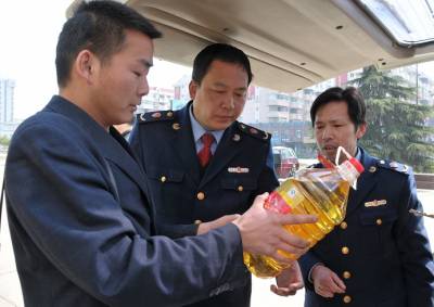 红安县工商局接到群众举报,称有经营者销售假“金龙鱼”食用调和油。该局执法人员迅速出击一举查获了这批假“金龙鱼”食用调和油。经与金龙鱼厂家技术人员的仔细鉴定后,确认了这批“金龙鱼”食用调和油为假冒产品。执法人员将查获的30瓶假“金龙鱼”食用调和油予以查封,此案正在调查处理之中。图为该局执法人员与金龙鱼厂家技术人员正在做鉴定。