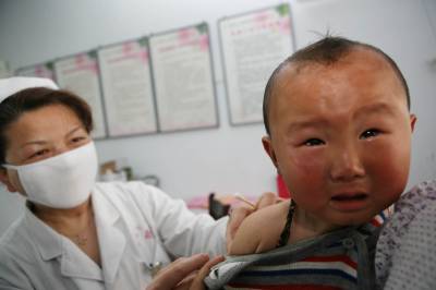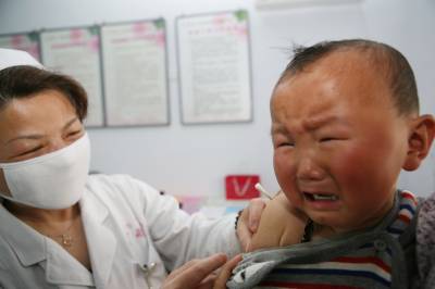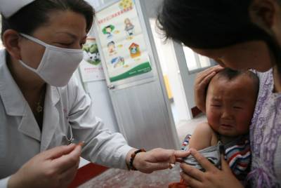 4月25日,在襄阳市高新区紫贞社区卫生服务中心,一位护士为流动儿童免费接种疫苗。 当日是“全国儿童预防接种日”,在湖北省襄阳市高新区紫贞社区卫生服务中心,医务人员为外地进城务工人员的小孩接种疫苗。据了解,日前,襄阳市已将流动儿童纳入市区常规免疫管理,享有与本地儿童一样的疫苗接种服务。今年全国儿童预防接种日的主题是“接种疫苗,宝宝健康”。