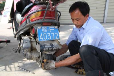 回乡创业好赚钱 4月24日,冷集镇个体工商户方天国正在帮客户修理摩托车。今年40岁的方天国2008年在谷城县冷集信用社的贷款支持下,自费外出学习维修摩托车技术。如今他在集镇上租赁了门面,收了徒弟,和妻子一道经营、维修摩托车,年收入远高于在外在打工,日子过的格外幸福。 本报视界网马明刚摄