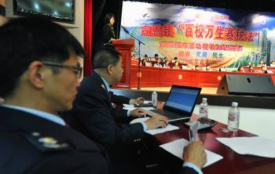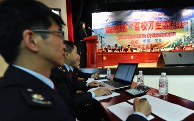 4月26日,宣恩县城乡小学生参加由该县国税部门组织的税收知识竞赛。 今年4月是全国第20个税收宣传月,宣恩县以“税收·发展·民生”为税收宣传主题,采用网络征文、税收主题演讲、主题文艺晚会、税收知识竞赛等方式,在校园里广泛宣传税收法律法规,以逐步提高少数民族地区民众依法纳税、诚信纳税意识。本报视界网 宋文 摄
