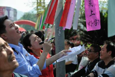 4月26日,宣恩县社区居民在参加“税收灯迷”竞猜活动。 当日,宣恩县地税局在民族路社区举办“有奖猜灯迷”活动宣传税收知识。 今年4月份是全国第20个税收宣传月。当税务部门围绕“税收、发展、民生”主题,开展税收知识进学校、到厂矿、入社区活动,多形式宣传税收知识,提高民族地区民众纳税、护税意识。本报视界网 宋文 摄