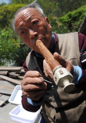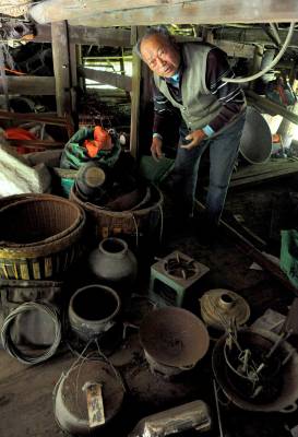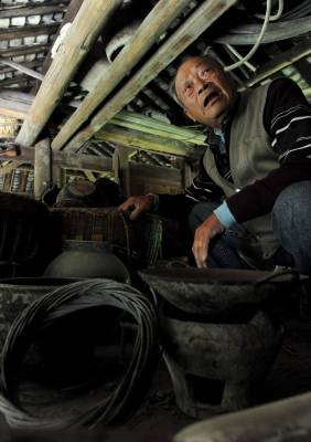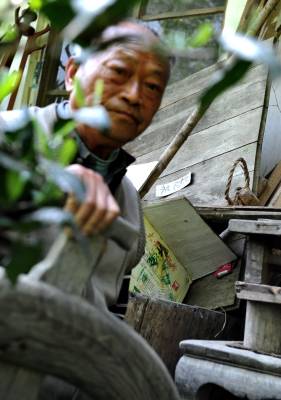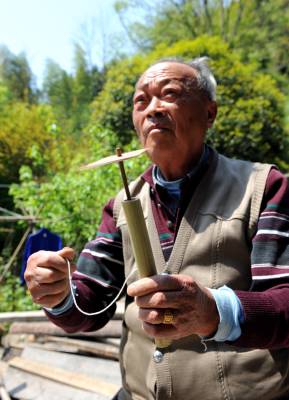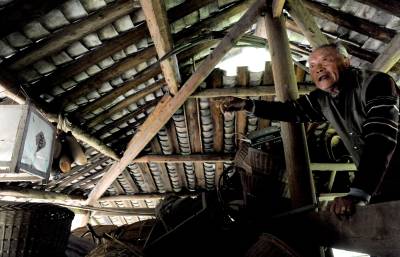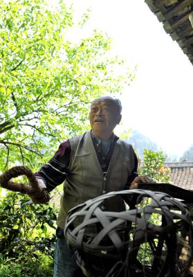 4月25日,宣恩县高罗乡板寮村土家族老人朱耀展示他收藏的当地生产生活所用的器具。83岁的土家老人朱耀,退休前是一位教师,一直热衷于收藏。他与别的收藏家不同,专门收藏当地群众生产生活中的普通用具,特别是那些从人们生活中消失的东西。各种各样的瓶瓶罐罐,从砍削刨挖的犁耙锄头,到各式的摇篮摇床、精致漂亮的篮篓、形状各异的烟杆、朴实无华的箱屉……几年来,他收藏的东西达到了近千件。从他的那些藏品中,人们可以还原百年前当地的风土人情和生活习俗。 (视界网田丹)