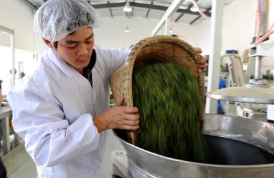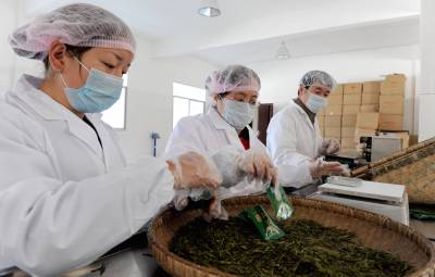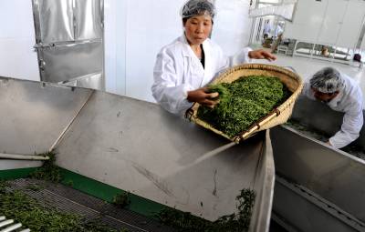 4月26日,工人在宣恩县椒园采花茶叶专业合作社的标准化厂房里加工“伍家台贡茶”系列产品。近年来,拥有12万亩茶叶基地的宣恩县致力规模化、标准化、有机化生产,充分发挥“伍家台贡茶”这一弥足珍贵的历史文化品牌的优势,做大做强全县茶叶产业,16家茶叶企业、31个茶叶专业合作社在政府主导、企业主体、市场运作的激励下,攥紧拳头,集群出击,对全县“伍家台贡茶”实行品牌整合。通过品牌整合,今年的茶叶鲜叶价格、销售价格、产值同比超历史,使得茶农、企业直接经济效益剧增。(视界网田丹)