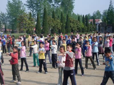 4月25日,钟祥市文集陈集小学全校学生在操场上学做武术健身操——旭日东升。这标志着武术健身操学习在该校正式拉开序幕。该武术健身操由教育部和国家体育总局组织创编,共四套。目前,钟祥市中小学都在组织学生学习该健身操。