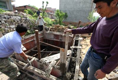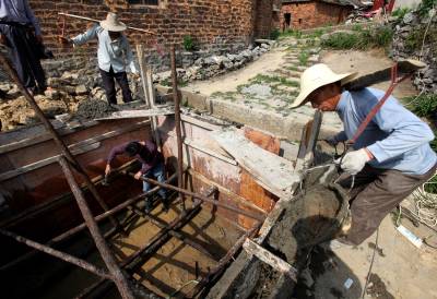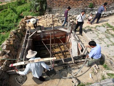 黄石经信委驻阳新县大王镇下堰村“三万”活动工作队,了解到该村庙垅湾390多位村民的饮用水井年久失修.污染严重,村民们每次喝水胆战心惊。为了让村民早日喝上放心水,驻村工作队在委领导大力支持下很快筹集资金17000元,水井改造从4月16日开始动工,今天(4月27日)水井改造进入混凝土浇灌阶段,图为施工人员浇灌混凝土。驻村以来经信委“三万”活动工作队队员与村民同吃同住同劳动,他们利用晚上时间走访了该村全部348户农户。